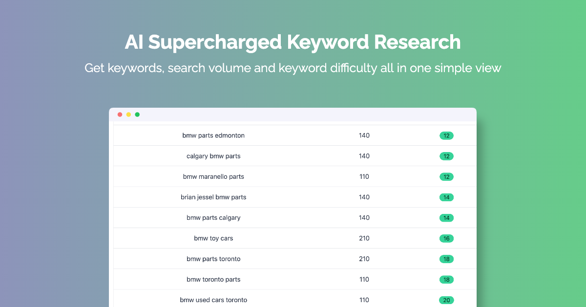 You provide a single "seed" keyword, and we use our proprietary code to find you hundreds of topics to cover. Our GPT-4o-mini powered AI engine is able to provide you with natural language keywords. The difference from regular keyword research tools is that our keywords are modelled after how people actually search for things in search engines. We also include keyword search volume (estimatation of searches per month) and keyword difficulty (how hard it is to rank for that keyword).
