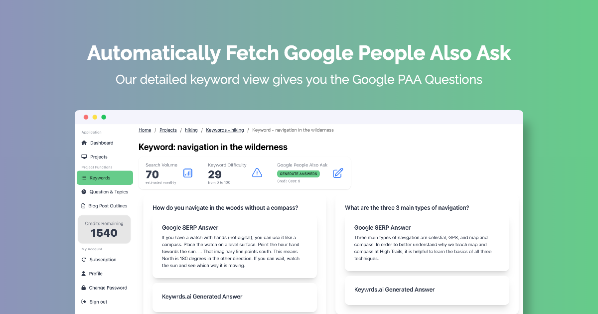 After generating keywords, you can fetch the Google 'People Also Ask' questions, and automatically write engaging and factual answers search engines want to see.
